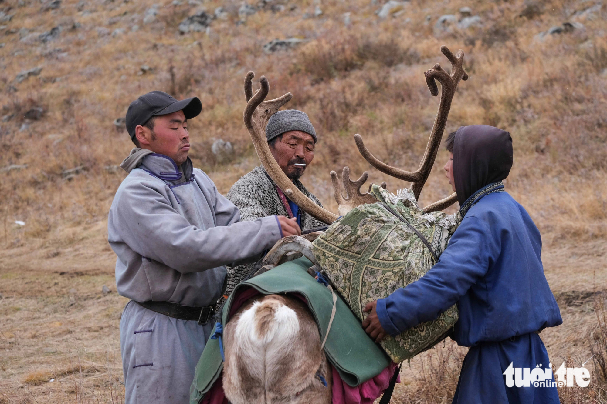 Hai chàng trai trẻ với đôi tay khéo léo, thoăn thoắt phụ Makhsar gói và chất đồ khách lên tuần lộc, đồng thời dùng cử chỉ tỉ mỉ hướng dẫn từng người cách cưỡi tuần lộc