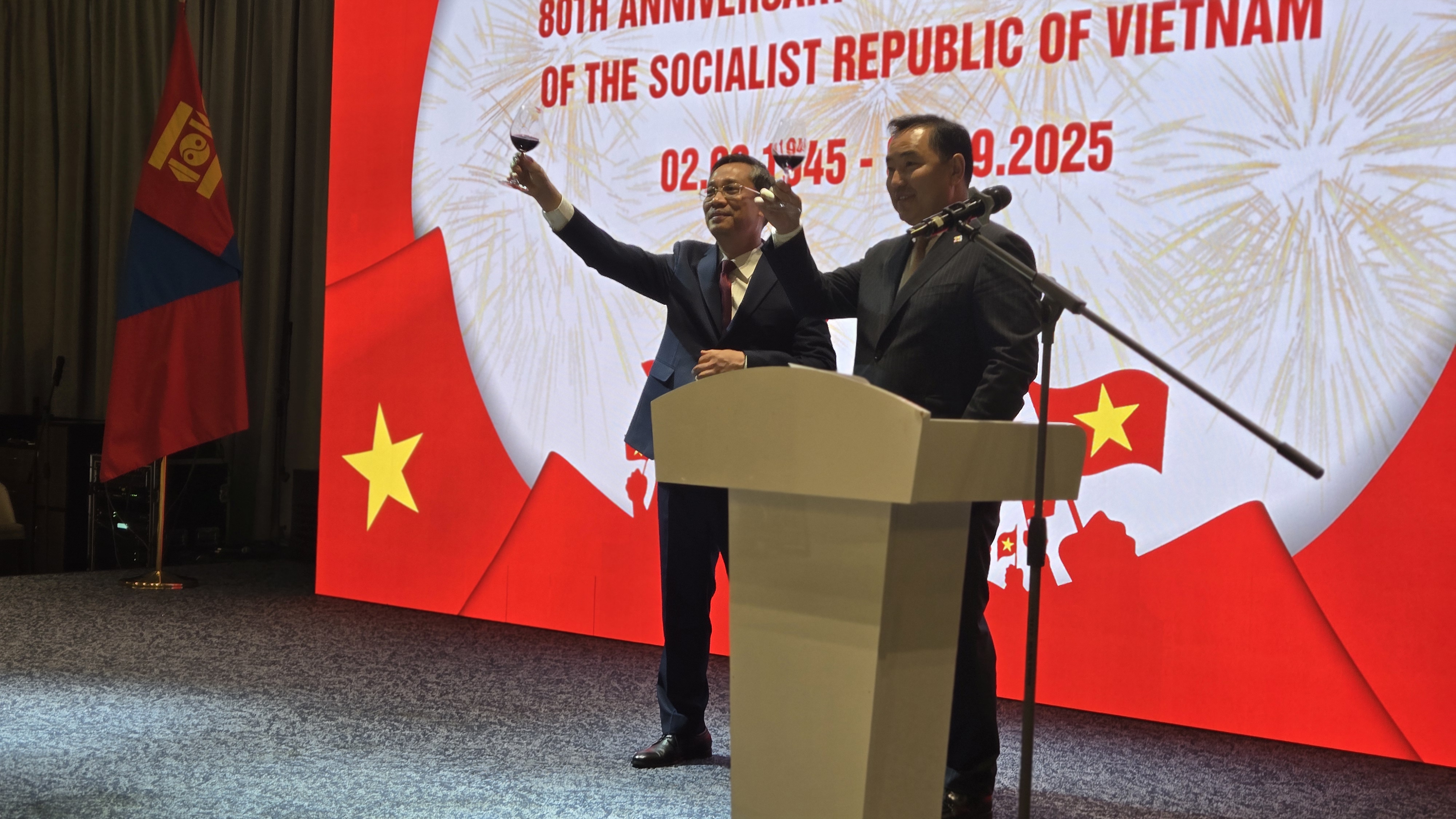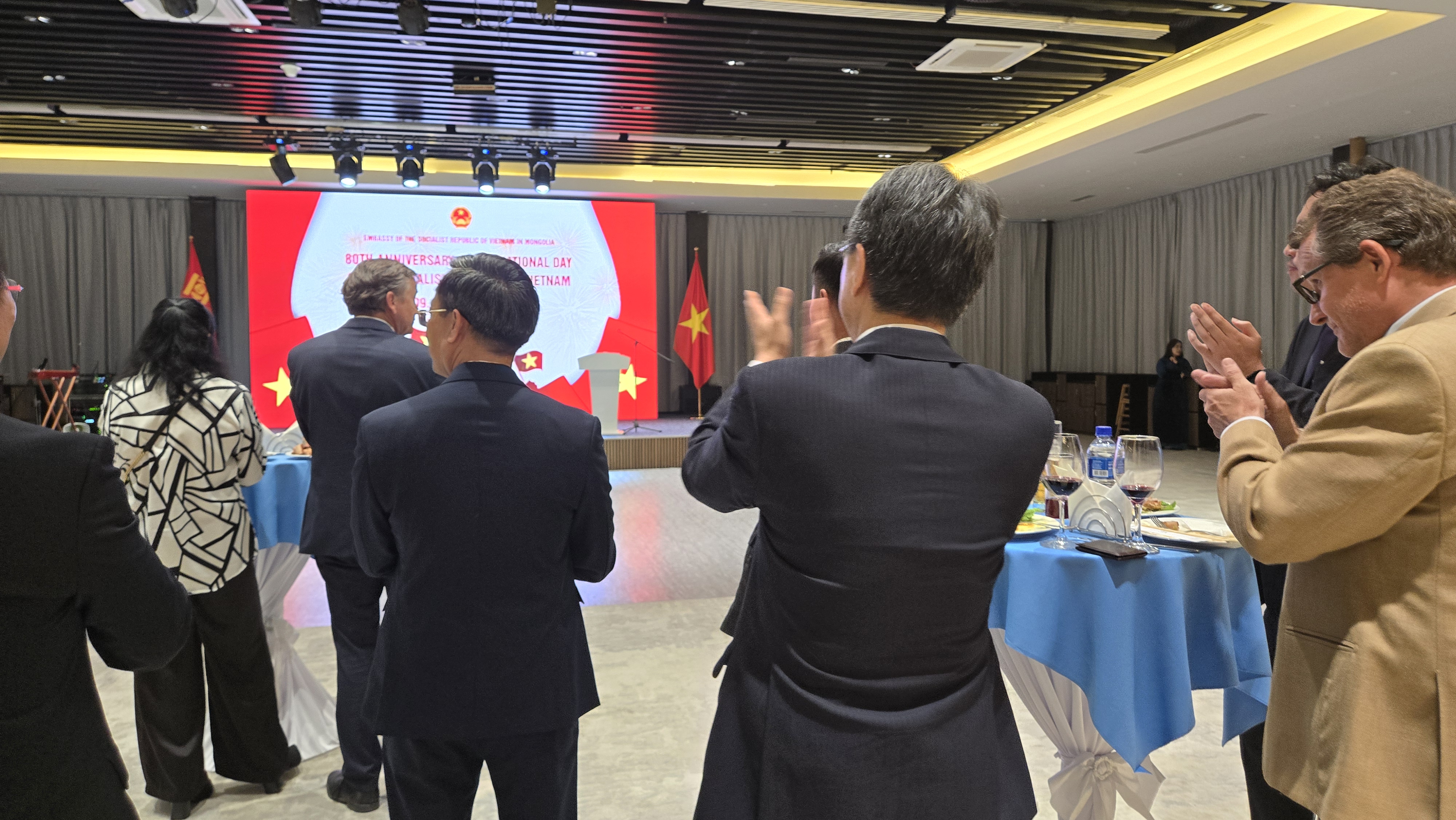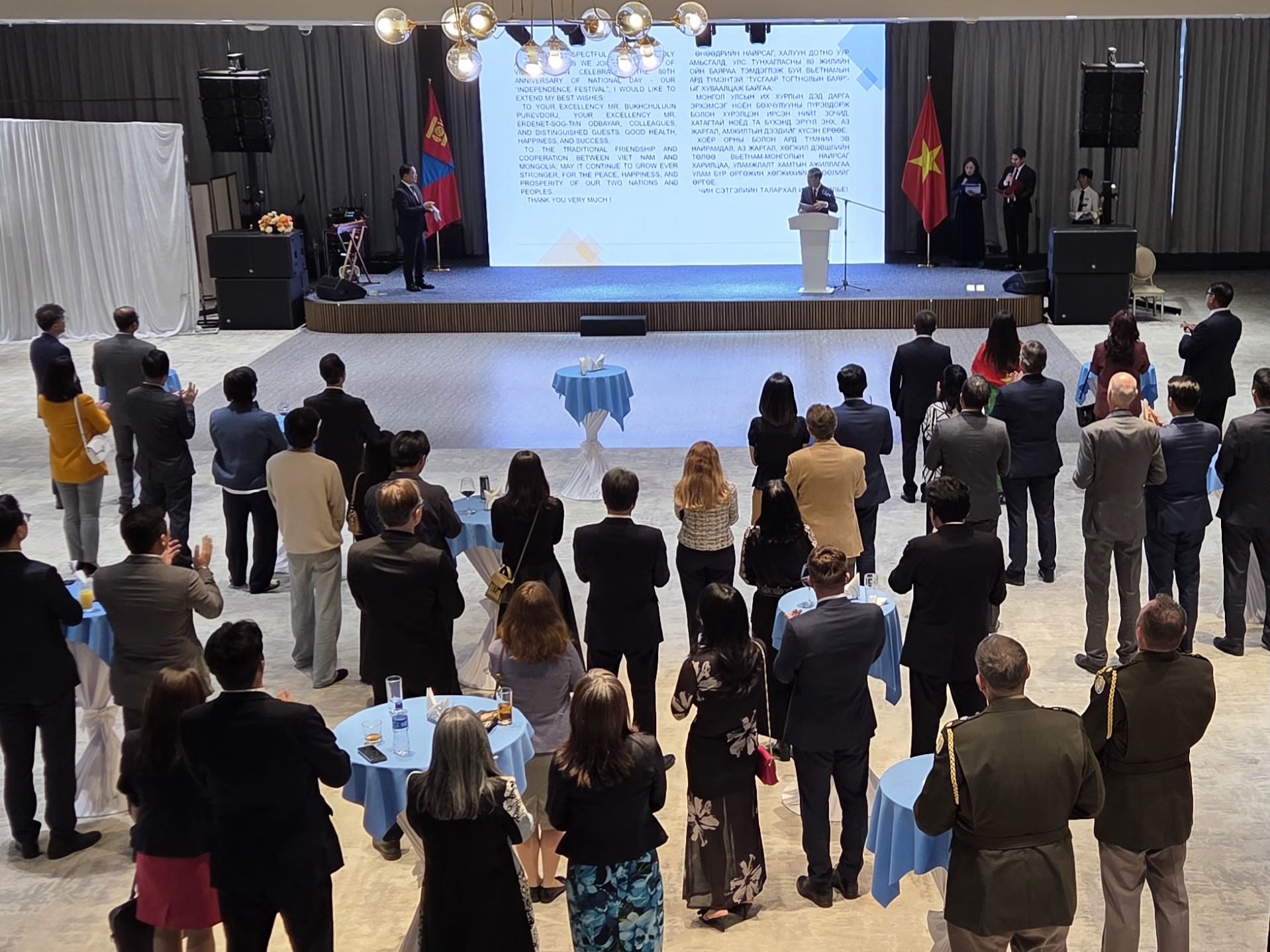 Trong không khí thân tình và ấm áp, Đại sứ Nguyễn Tuấn Thanh cùng các vị đại biểu đã nâng ly chúc mừng Quốc khánh Việt Nam, chúc mừng những thành tựu vẻ vang mà Đảng, Nhà nước và nhân dân Việt Nam đạt được trong suốt 80 năm qua, đồng thời chia sẻ niềm tự hào về tình hữu nghị gắn bó giữa hai nước. Các đại biểu đã giao lưu, trò chuyện, thưởng thức những tiết mục nghệ thuật đặc sắc, đậm đà bản sắc văn hóa Việt Nam, trong đó có phần độc tấu đàn bầu do nghệ sỹ nhân dân thuộc đoàn Nhà hát Kịch Hà Nội biểu diễn, để lại nhiều ấn tượng sâu lắng cho bạn bè quốc tế và kiều bào. Những món ẩm thực truyền thống được chuẩn bị chu đáo cũng góp phần làm ấm thêm bầu không khí trang trọng mà gần gũi của ngày lễ. Đông đảo bà con cộng đồng người Việt Nam tại Mông Cổ đã đến dự, bày tỏ niềm xúc động và tự hào khi được trực tiếp tham gia, đóng góp vào sự kiện trọng đại kỷ niệm 80 năm Quốc khánh. Đây không chỉ là dịp ôn lại chặng đường lịch sử vẻ vang của dân tộc, mà còn là cơ hội thắt chặt tình đoàn kết, gắn bó giữa bạn bè quốc tế, nhân dân Mông Cổ với cộng đồng người Việt Nam, lan tỏa tinh thần độc lập, tự do và tình hữu nghị bền chặt giữa hai dân tộc.