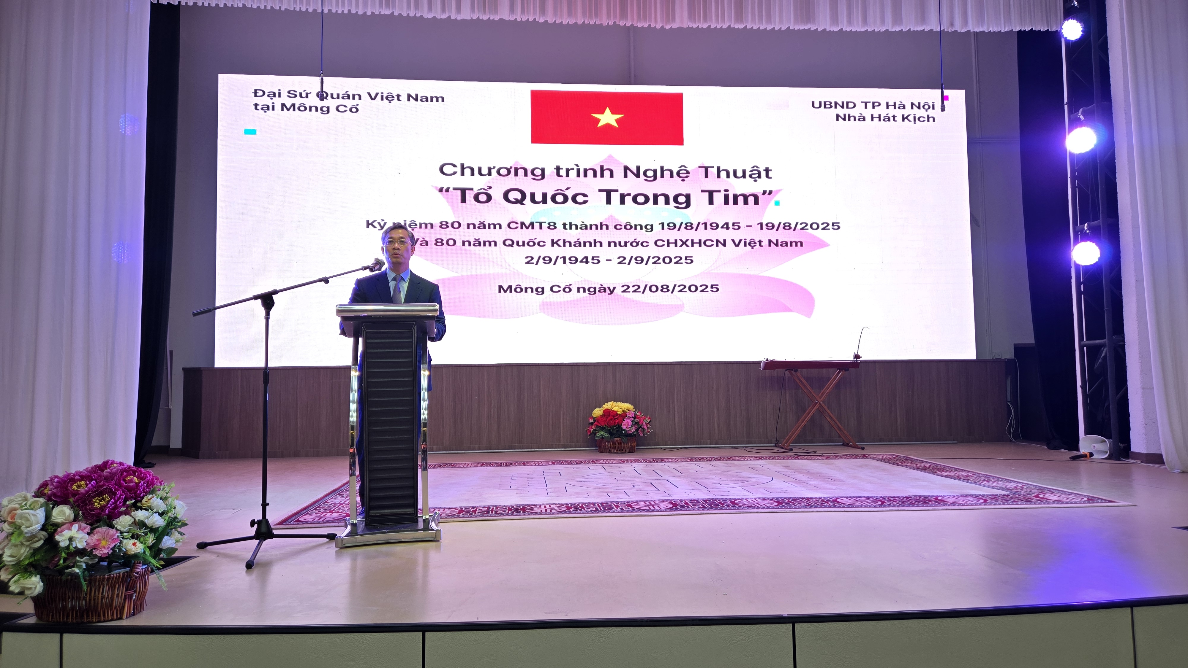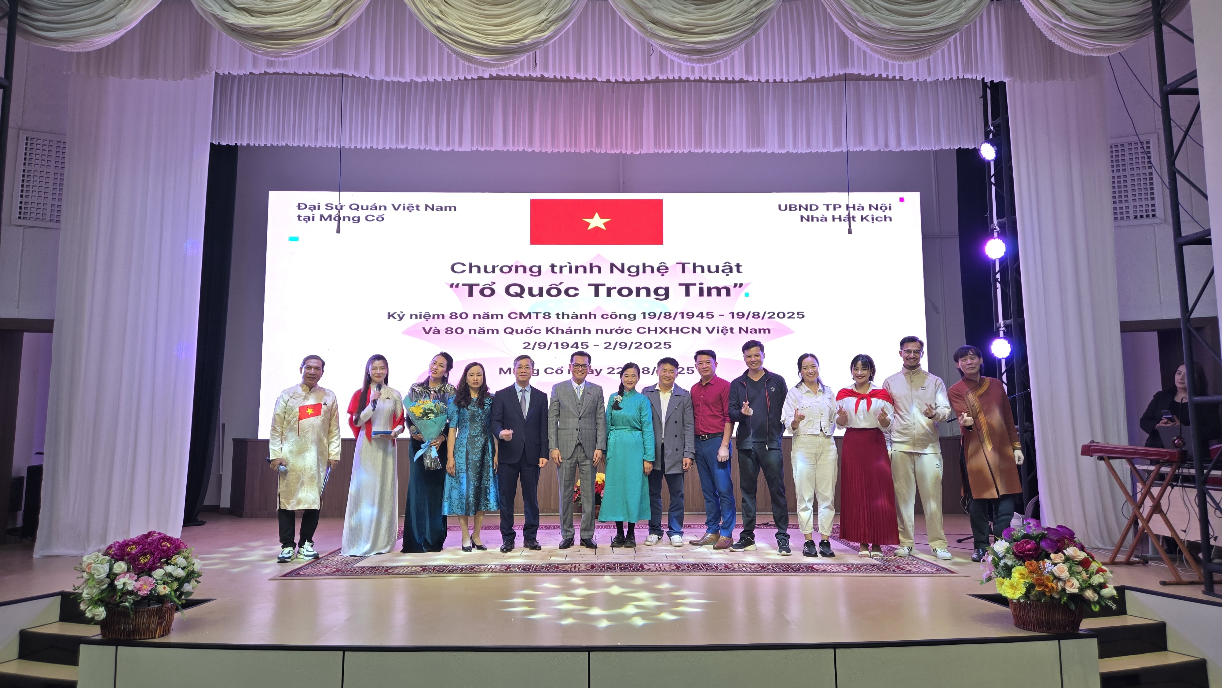 Trước đó, trong khuôn khổ kỷ niệm 80 năm Cách mạng Tháng Tám thành công (19/8/1945 - 19/8/2025) và 80 năm Quốc khánh nước CHXHCN Việt Nam (02/9/1945 - 02/9/2025), ngày 22/8/2025, Đại sứ quán Việt Nam tại Mông Cổ phối hợp cùng Ủy ban nhân dân Thành phố Hà Nội, Nhà hát Kịch Hà Nội và Hội Người Việt Nam tại Mông Cổ đã tổ chức chương trình nghệ thuật mang tên "Tổ quốc trong tim", dành riêng cho bà con kiều bào hướng về quê hương. Chương trình được tổ chức công phu với các tiết mục ca múa, độc tấu đàn bầu, tiểu phẩm kịch và dân ca truyền thống, nhằm tái hiện hình ảnh văn hóa đa dạng và giàu truyền thống.